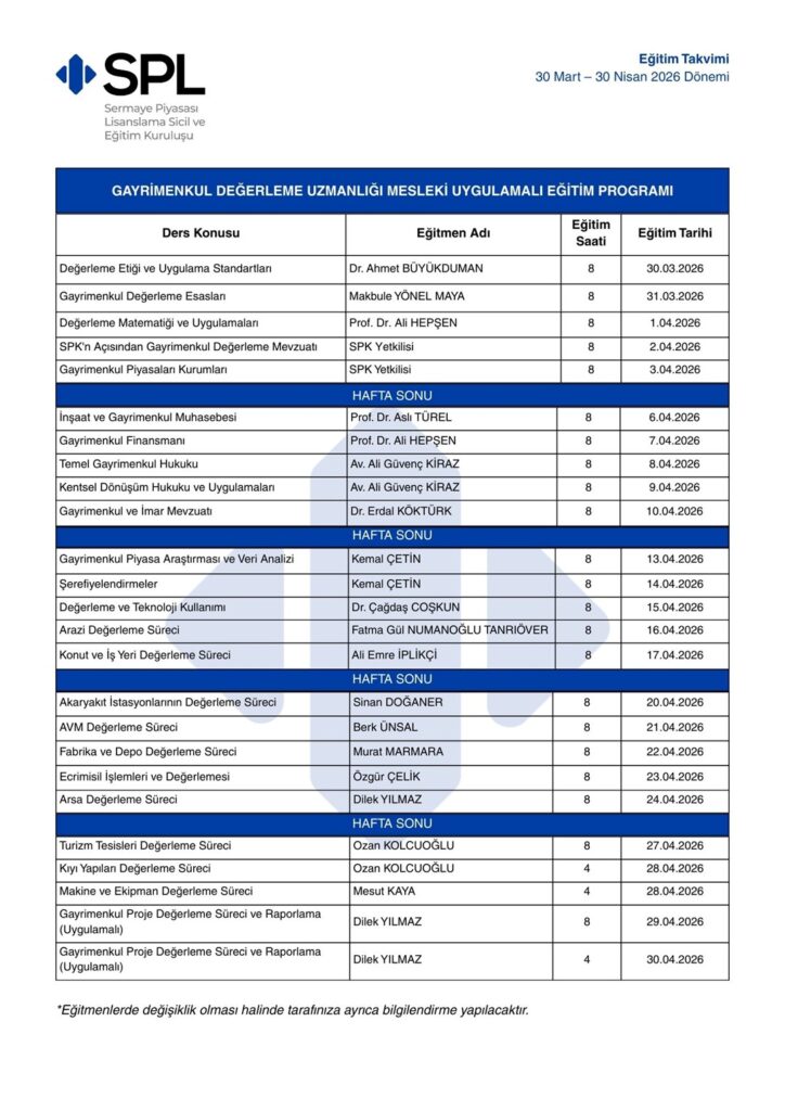 Eğitim sonunda; “Eğitime %85 ve üzeri oranında devamlılık sağlayanlar” (eğitime devam şartı) ve “Uygulamalı Eğitim” modülünde yapılan değerleme projelerinden “65 ve üzerinde puan alanlar” (değerleme projesinden geçer not alma şartı) başarılı kabul edilip III.62.3 sayılı Sermaye Piyasasında Faaliyette Bulunacak Gayrimenkul Değerleme Kuruluşları Hakkında Tebliğ’in 3’üncü maddesinde aranan gayrimenkul değerleme uzmanı veya konut değerleme uzmanı olarak görev almak için gerekli ilgili tecrübe koşulunu sağlamış sayılacaklardır. Eğitime devam ve değerleme projesinden geçer not alma koşullarının ikisinin de sağlanması gerekmektedir. Mevzuatta aranan diğer şartlar hakkındaki değerlendirmeler saklıdır.