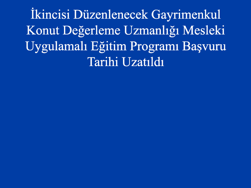 27 Ocak – 27 Şubat 2025 tarihleri arasında İstanbul Workinton Levent 199’da gerçekleştirilecek olan Gayrimenkul / Konut Değerleme Uzmanlığı Mesleki Uygulamalı Eğitim Programı için başvuru süresi, 20 Aralık 2024 Cuma günü saat 16:00’a kadar uzatılmıştır.