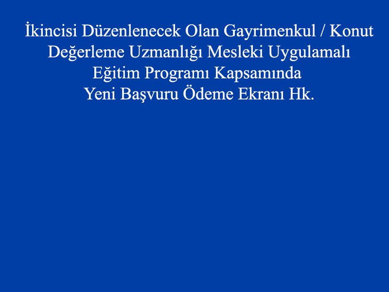 Gayrimenkul / Konut Değerleme Uzmanlığı Mesleki Uygulamalı Eğitim Programı başvuruları kapsamında, ikincisi düzenlenecek olan eğitim programı 27 Ocak – 27 Şubat 2025 döneminde gerçekleştirilecektir. Programa ilişkin ödeme ekranı aktif hale getirilmiş olup katılım ücretlerinizi belirtilen ödeme yöntemleriyle SPL Başvuru Sistemi üzerinden gerçekleştirebilirsiniz.