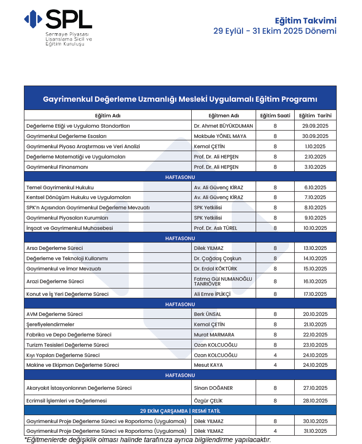 Detaylı bilgi için tarafımıza gayrimenkulegitimleri@spl.com.tr e-posta adresi üzerinden ulaşabilir veya 0 850 532 34 34 numaralı Uzman Danışma Hattımız aracılığıyla bizimle iletişime geçebilirsiniz.